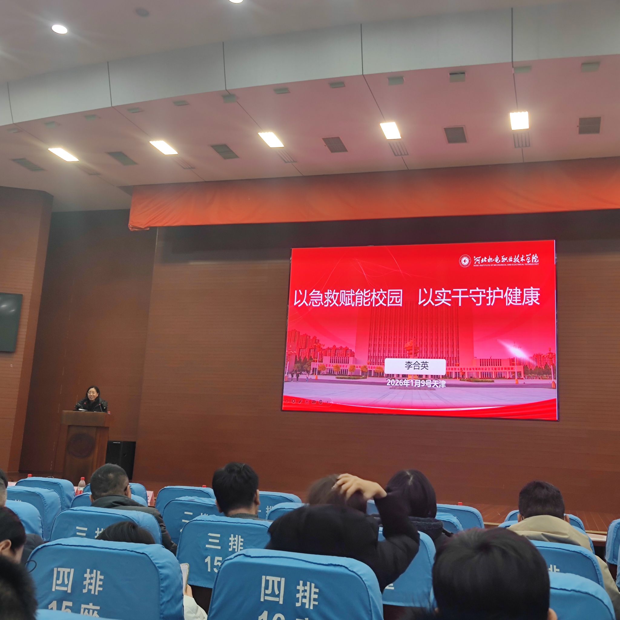 作为河北省高校代表,李合英以《以急救赋能校园 以实干守护健康》为题作经验分享,从组织制度根基、分层培训体系、硬件设施建设、实践宣传矩阵四大维度,系统阐述了学校急救教育的创新实践。汇报中,"党政双组长" 领导机制、覆盖新生与重点岗位的分层培训模式、15 台 AED 全域部署的硬件保障、将急救融入社会实践活动、"理论 + 实践 + 宣传" 的立体化工作矩阵等特色举措,全面展现了学校将急救教育融入校园发展全局的系统思维,为京津冀高校提供了可复制、可推广的实践样本。