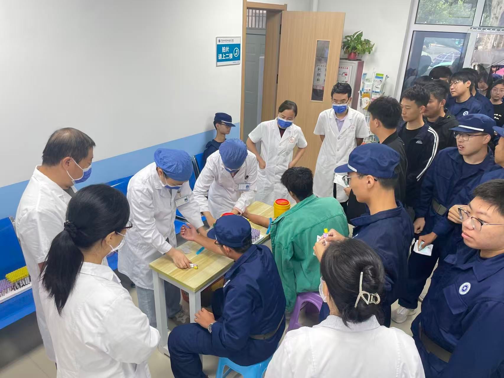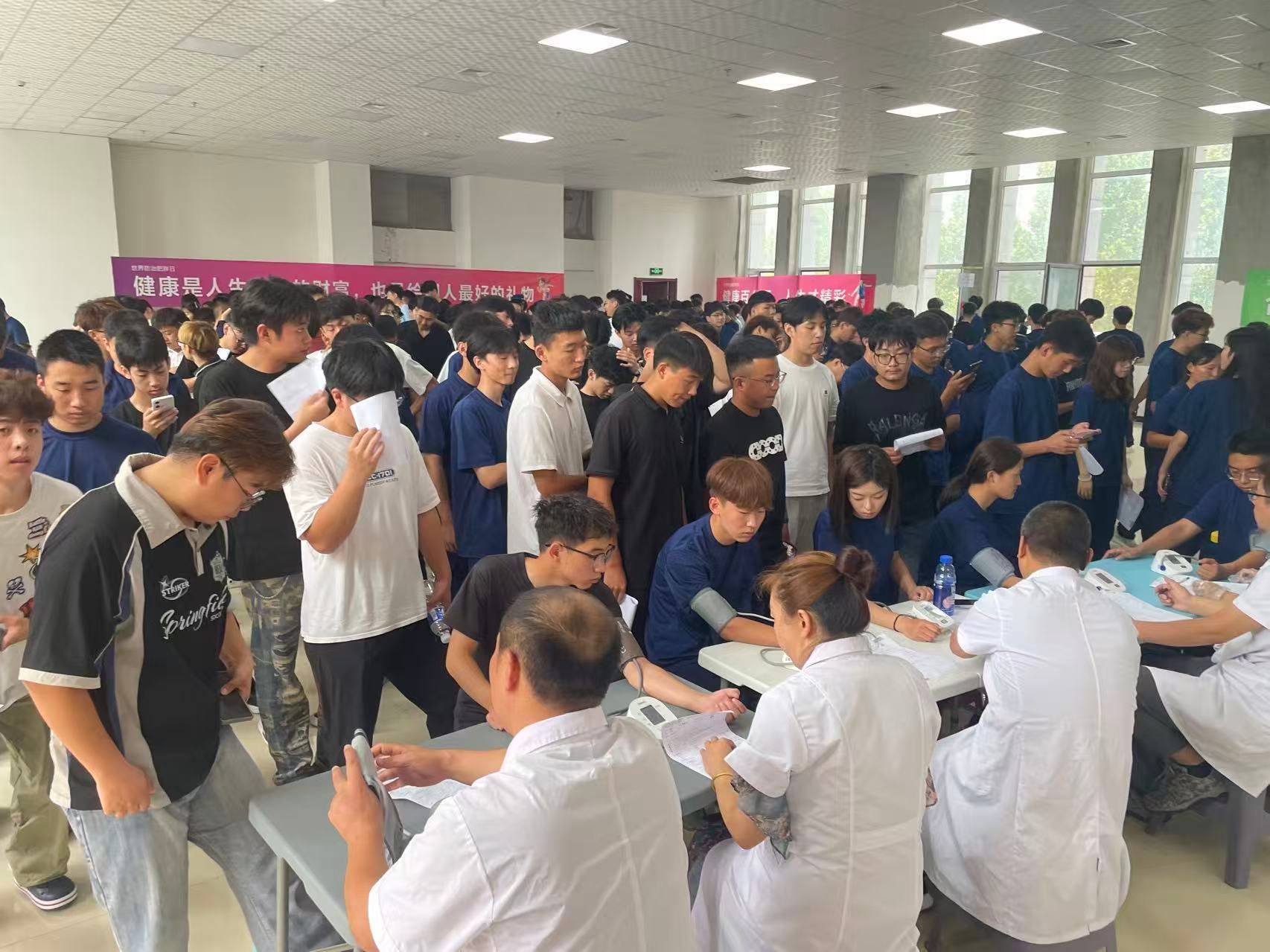 周密部署,筑牢新生健康 “第一关”。为确保新生体检工作高效有序推进,医务室在前期进行了细致筹备。一方面,提前与招生就业处、学生工作部、各系部及医院沟通协调,根据各系部新生人数、军训安排等制定分批次体检方案,避开教学与军训训练高峰时段,减少对新生日常安排的影响;另一方面,优化体检流程,设置采血、胸透、其他检查如心电图、身高体重测量、视力检查、内科问诊等 3个专项检查区域,每个区域安排专人引导,有效避免拥堵,提升体检效率。体检过程中,医护人员严格遵循医疗规范,对每一项检查数据仔细核对、精准记录。针对部分新生可能存在的视力异常、血压偏高等情况,医护人员当场给出健康指导,并建立 “一人一档” 健康档案。