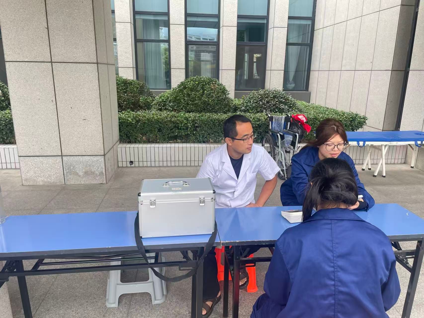 全程值守,守护军训安全 “生命线”。军训期间,新生需在户外进行长时间队列训练,高温、体力消耗大等因素易引发中暑、擦伤、肌肉拉伤等健康问题。为此,医务室在军训指挥中心设立临时医疗点,配齐急救箱、轮椅、诊查床等基础医疗设备,储备藿香正气水、清凉油等防暑药品,以及云南白药、碘伏、纱布、创可贴等外伤处理用品,安排1名专业医护人员与1名社团志愿者全程在岗值守,确保各类突发健康状况能第一时间响应、第一时间处置。另外,面对激增的就诊需要,医务人员都主动加班加点,以保障就诊学生能得到及时诊治;同时,考虑到高温天气对新生身体的影响,每日专人负责烧水泡制菊花茶饮,为新生补充水分、清热解暑,用细节传递校园关怀。