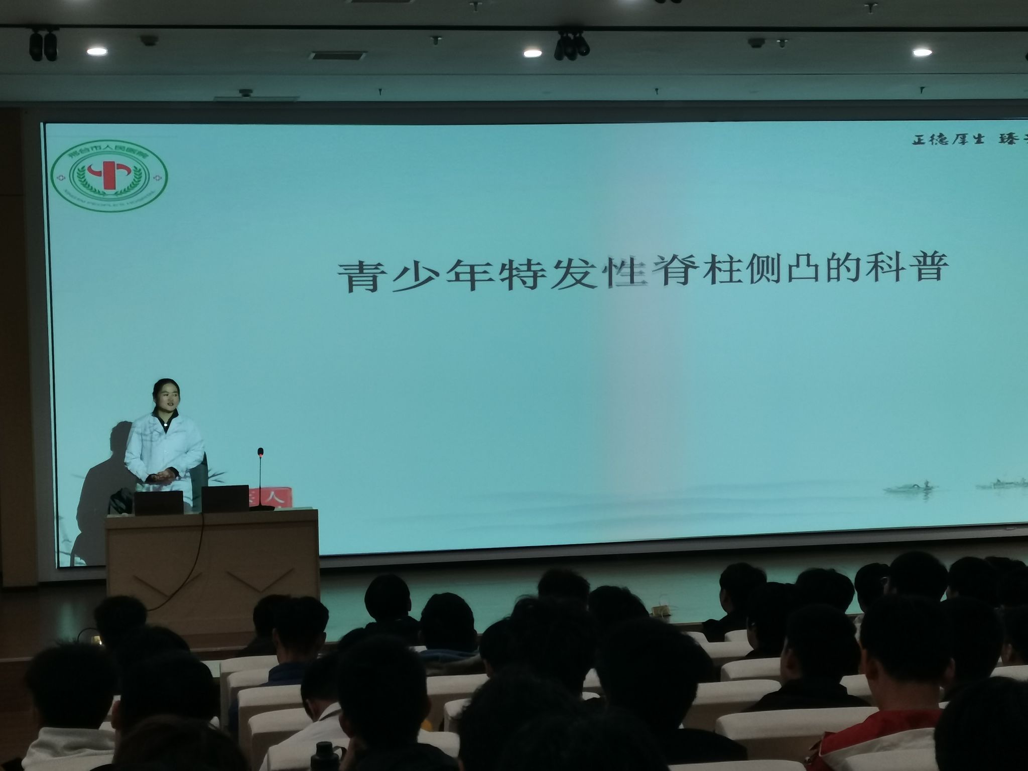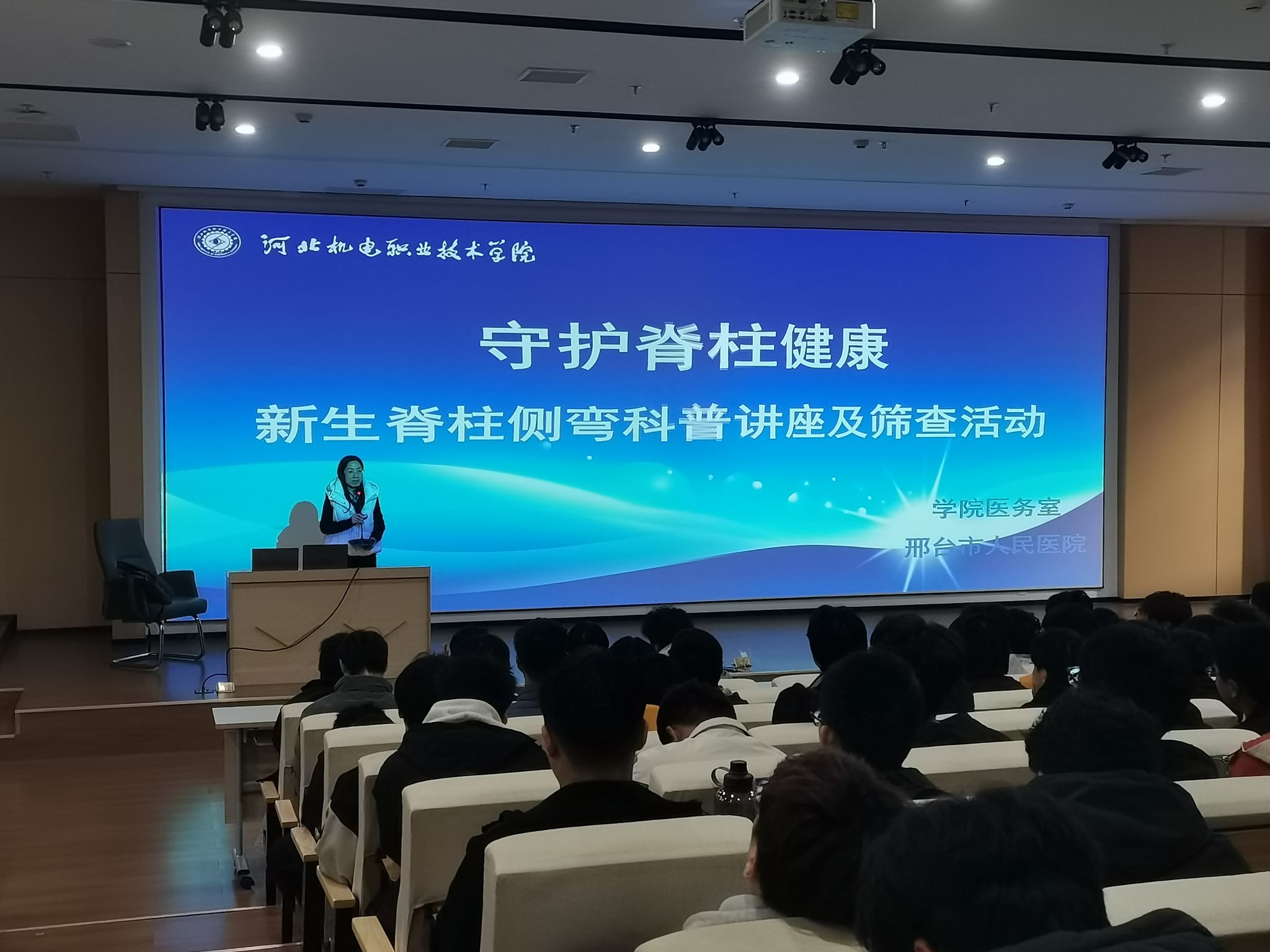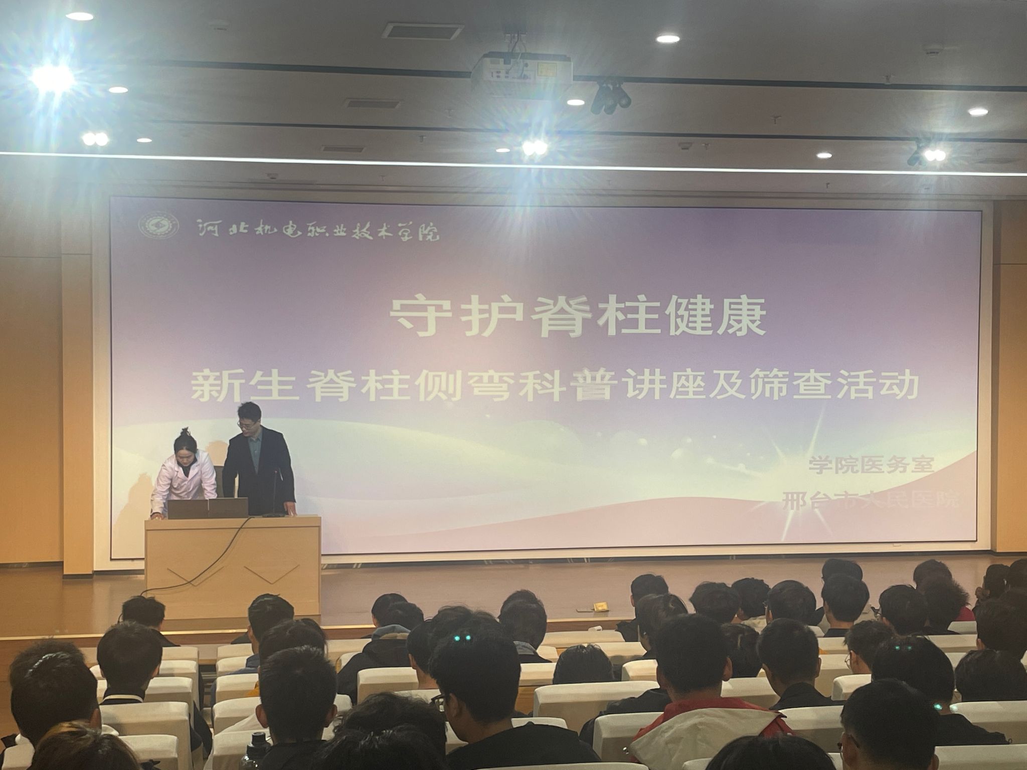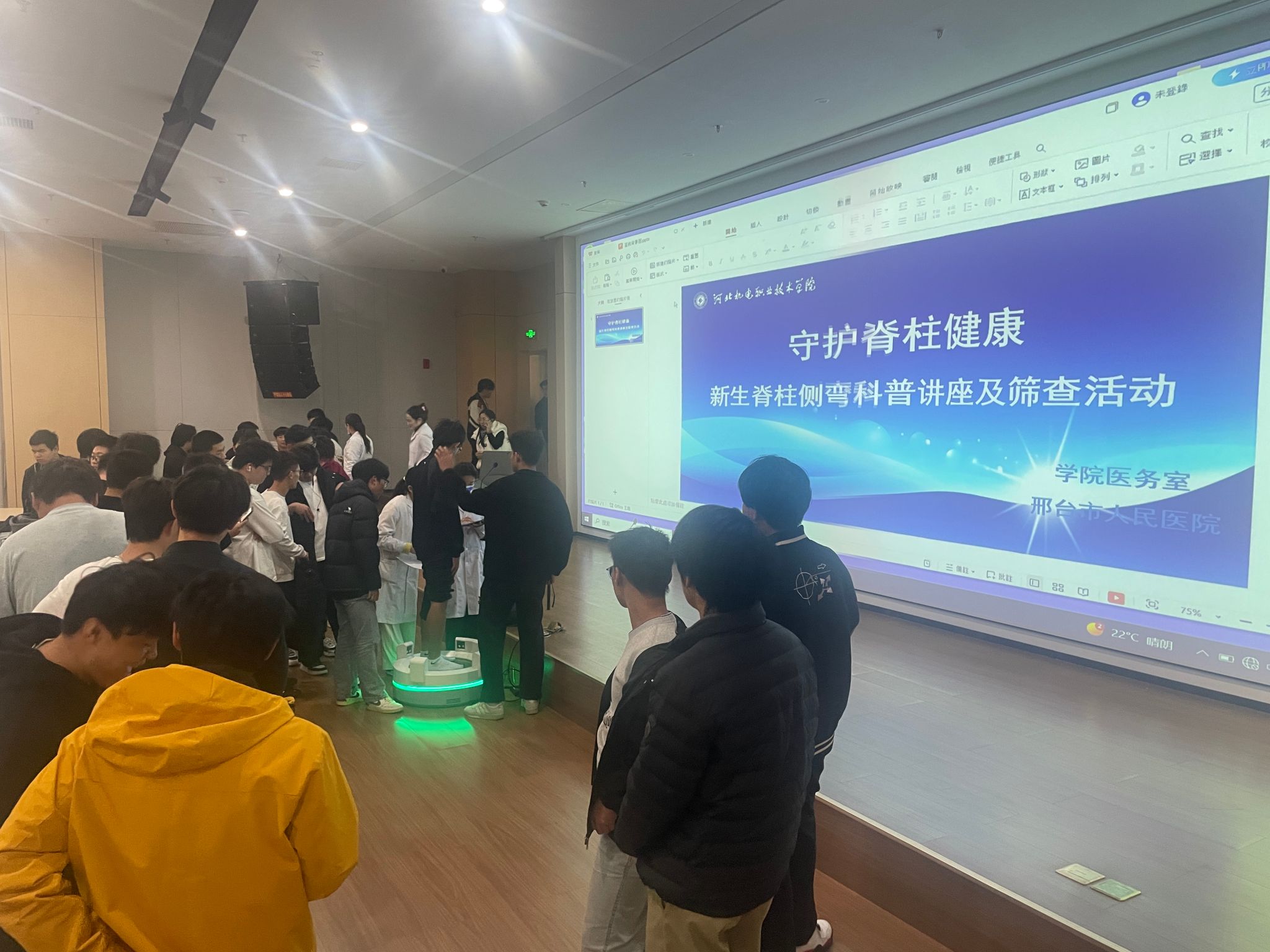 为及早发现并干预脊柱侧弯问题,守护青少年身心健康,10 月 31 日下午,我校联合邢台市人民医院儿童康复科在德润楼德龙报告厅开展脊柱侧弯健康科普讲座及公益筛查活动,200 余名大一学生参与。