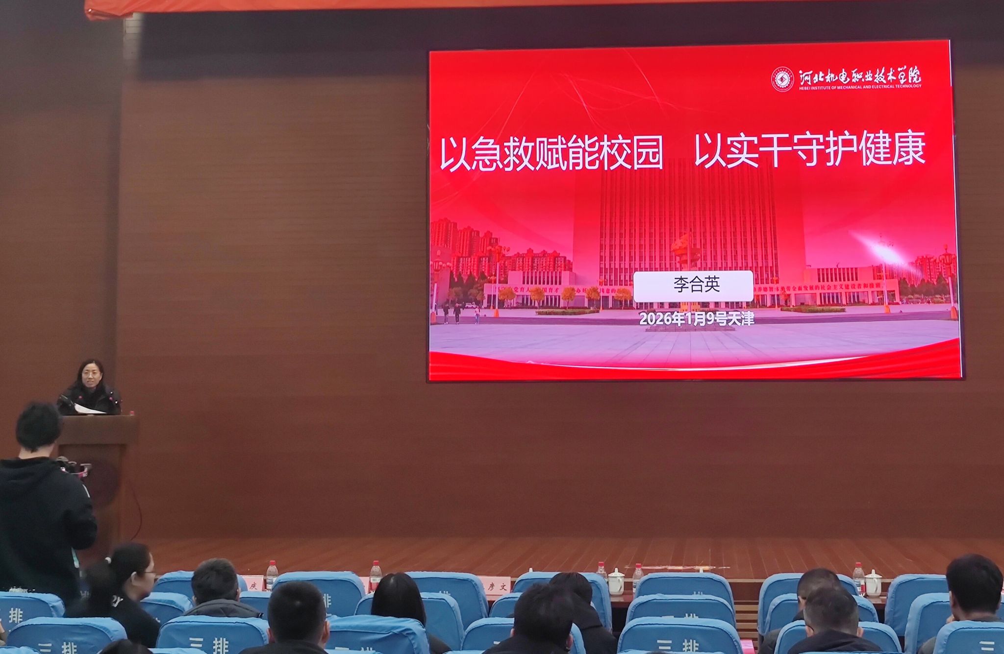 作为河北省高校代表,李合英以《以急救赋能校园 以实干守护健康》为题作经验分享,从组织制度根基、分层培训体系、硬件设施建设、实践宣传矩阵四大维度,系统阐述了学校急救教育的创新实践。汇报中,"党政双组长" 领导机制、覆盖新生与重点岗位的分层培训模式、15 台 AED 全域部署的硬件保障、将急救融入社会实践活动、"理论 + 实践 + 宣传" 的立体化工作矩阵等特色举措,全面展现了学校将急救教育融入校园发展全局的系统思维,为京津冀高校提供了可复制、可推广的实践样本。