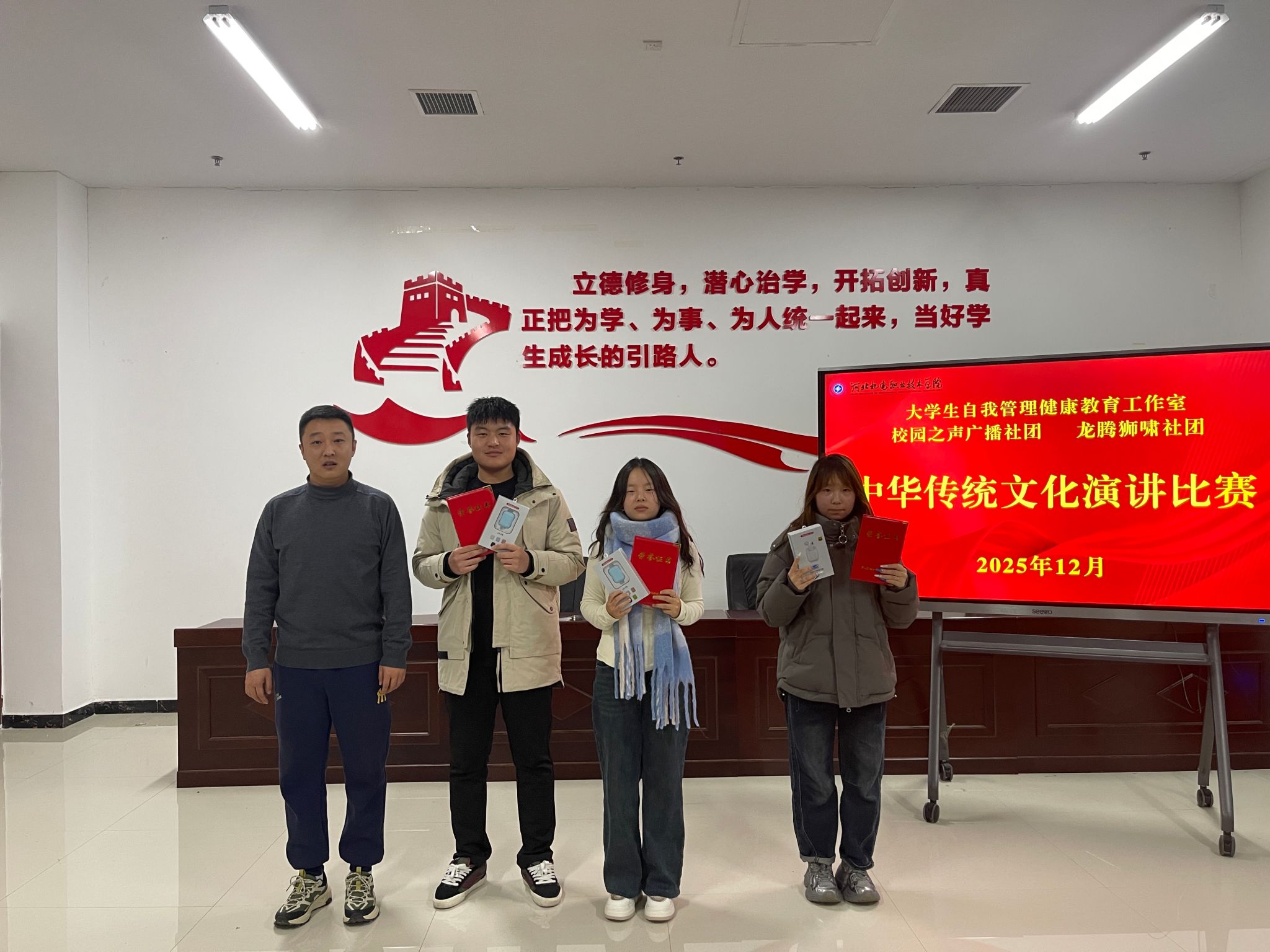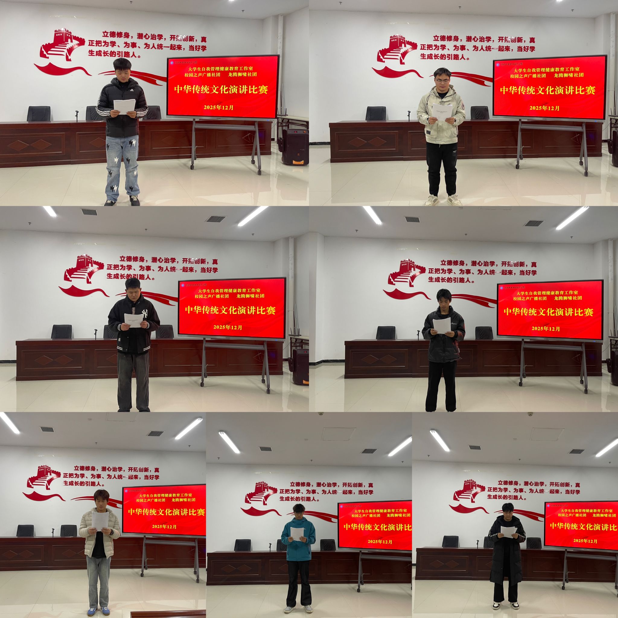 为传承弘扬中华优秀传统文化,涵养青年学子的文化自信与身心素养,大学生自我管理健康教育工作室携手校园之声广播社团、龙腾狮啸社团,于12月17日在科技创新中心218会议室联合举办“中华优秀传统文化”演讲比赛。